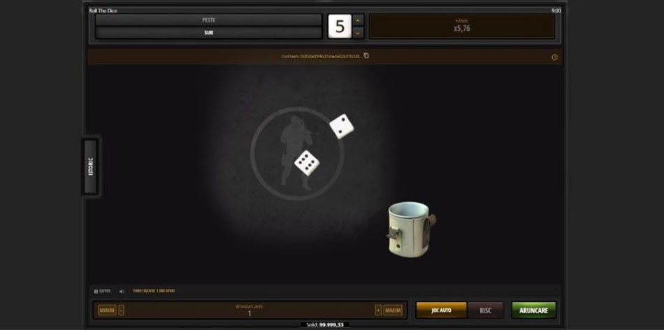 Roll the Dice, pariu setat sub 5, multiplicator de câștig 5,76x.