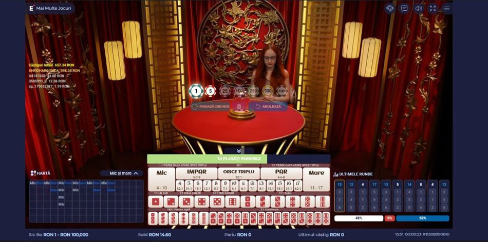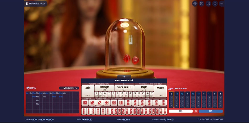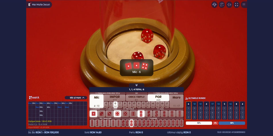 Sic Bo online de la Ezugi este un joc de zaruri pe bani reali la care ai cinci pariuri principale și multe alte opțiuni de pariere secundare. Se joacă cu trei zaruri care sunt activate de un sistem automat. Pariezi simplu, pe tabelul afișat și aștepți rezultatul.