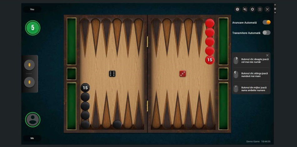 3 moduri de joc (Clasic, Lung și Asiatic), cu mize setate de jucători și opțiuni precum durata mutării și cubul de dublare.