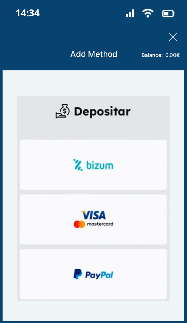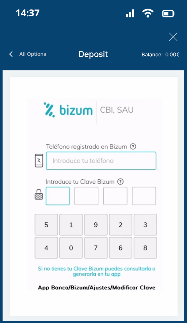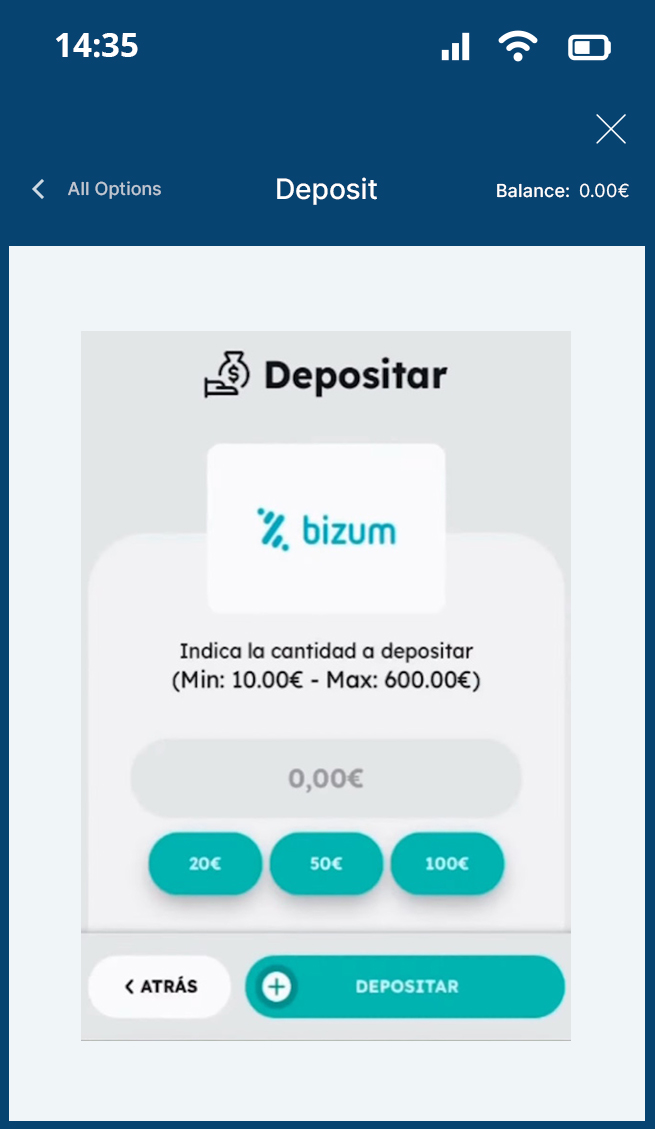 When given the choice of deposit options, select Bizum as your preferred payment method.