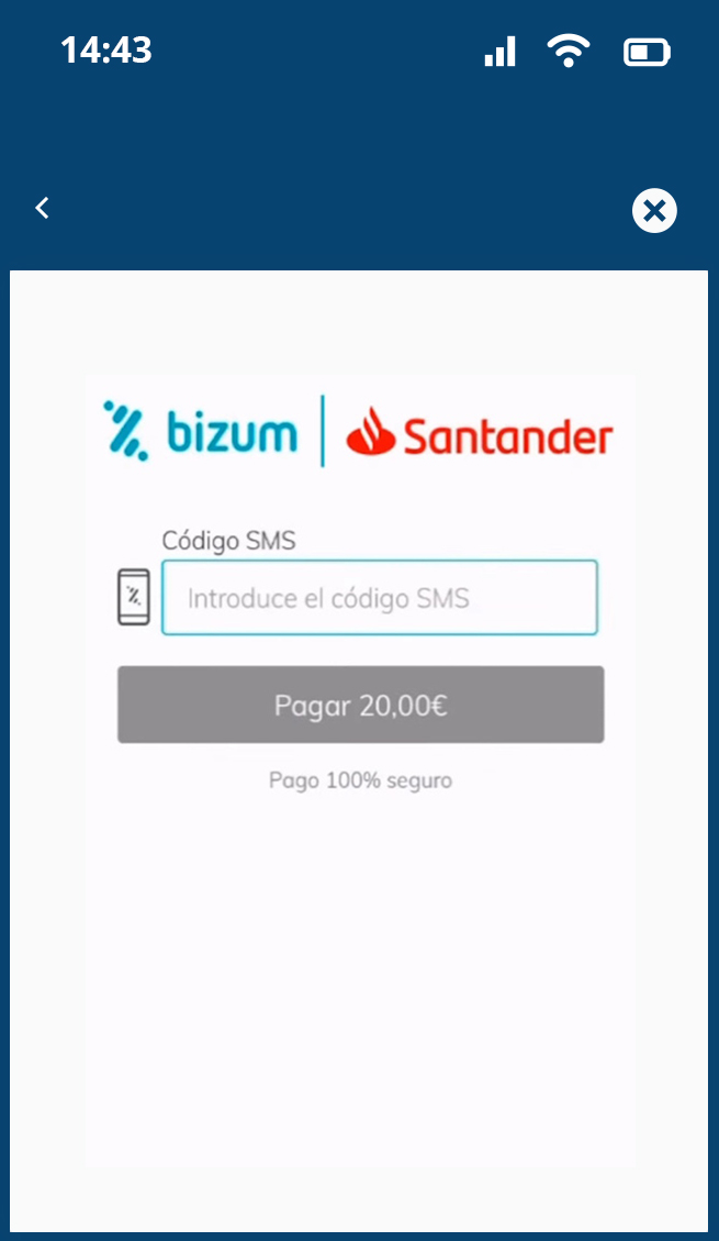 You will receive an SMS message with a 6-digit security code. Enter this code in the Bizum app, then “Pay” to complete the deposit transaction.