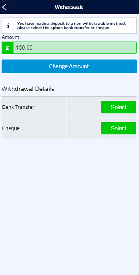 Select bank transfer from the cashier’s withdrawal section. Usually, you can use it only if you have deposited through it, but BetVictor and William Hill provide exceptions.