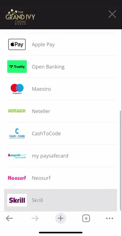 Once you have read the terms and conditions and checked for any fees, select Skrill as your preferred payment method at the casino cashier.