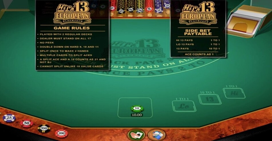 Hi Lo 13 European Blackjack Gold by Microgaming is part of their Gold Series of table games. This two-deck European blackjack variant stands out with its 99.60% RTP, Lucky 13 side bet paying up to 10:1, and the ability to hit split aces – a combination that adds strategic depth beyond standard European blackjack.