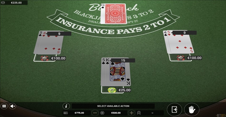 Insurance is available when the dealer shows an ace. Surrender is not offered, so every hand must be played to completion once dealt. There are no side bets in this variant.