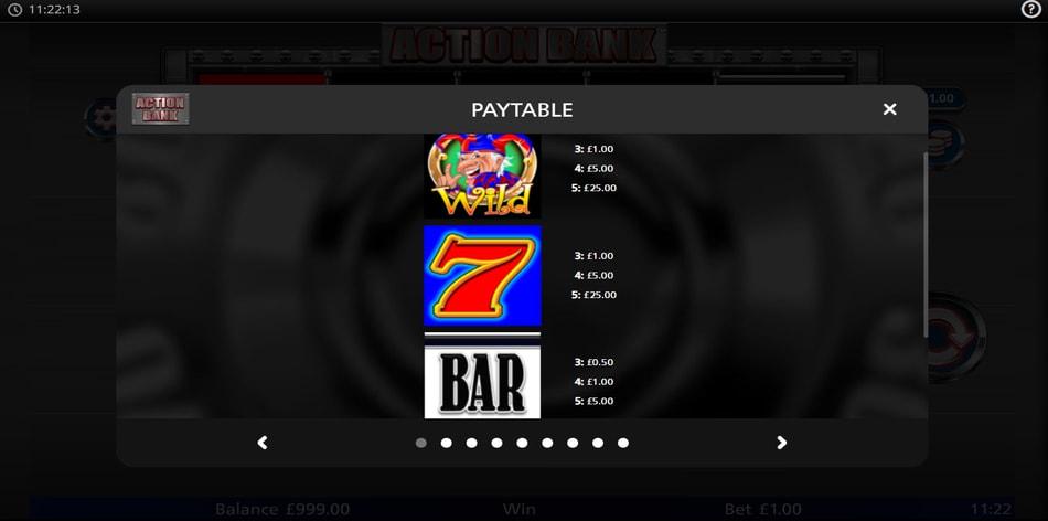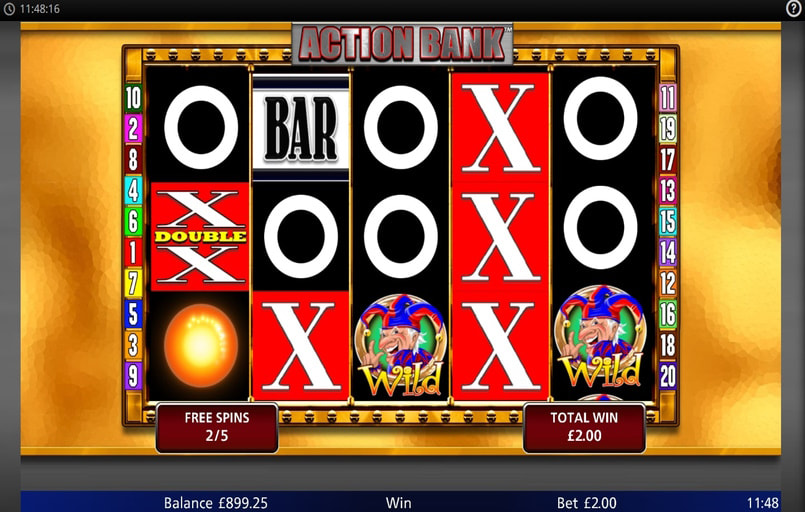 The Action Bank slot game’s 20 fixed paylines pay out from left to right in typical fashion. Unusually, there are only three paying slot symbols on the game, plus the joker wild symbol, but the other icons have the ability to transform into scatters and trigger the Action Bank free spins bonus round.