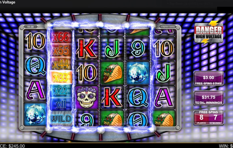 When two scatter symbols are on the reels, a blast of the Electric Six song plays to alert players of the potential bonus round, during which the song then plays out in full. Choosing High Voltage free spins earns 15 free spins with full reel Wilds paying up to x66 multipliers, while retriggering free spins is unlimited on that bonus round.