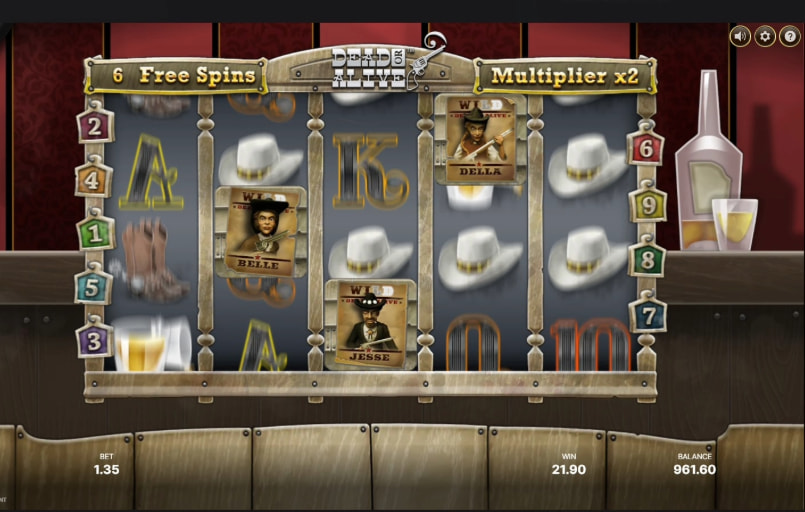 Getting three or more scatters – the crossed pistols icon in the game – gains access to the Dead or Alive free spins bonus round. Players are awarded 12 free spins initially and all wins during the bonus round are doubled, which is very welcome indeed.