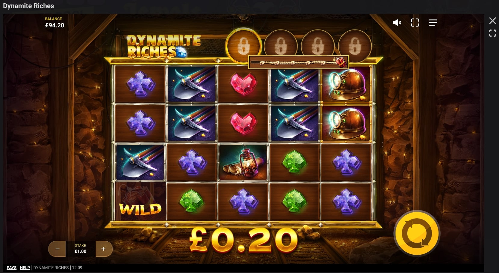 Dynamite Riches is a mining-themed online slot from Red Tiger. Released in November 2019, it’s a highly volatile slot with an RTP of 95.7% and a maximum payout of 5,341x your bet. There’s a free spins round and a progress metre that unlocks four features.