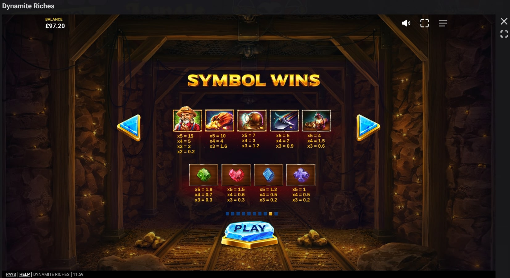 Dynamite Riches has nine regular symbols: four low-paying playing card suit icons and five high-paying symbols that are themed to mining. The most rewarding of these is the prospector with a top payout of 15x for five on a payline.