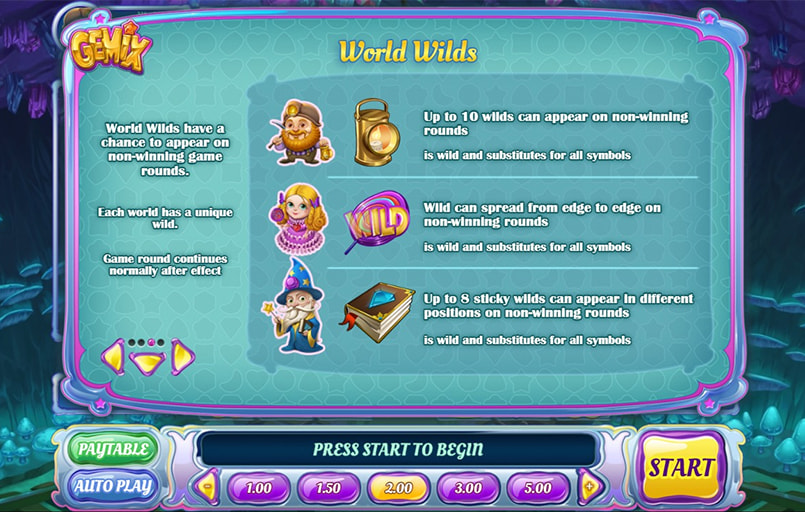 On any losing spin, a character associated with the current world can give you wilds. The miner adds up to 10, the princess turns a row of symbols into wilds and the wizard adds up to eight sticky wilds.