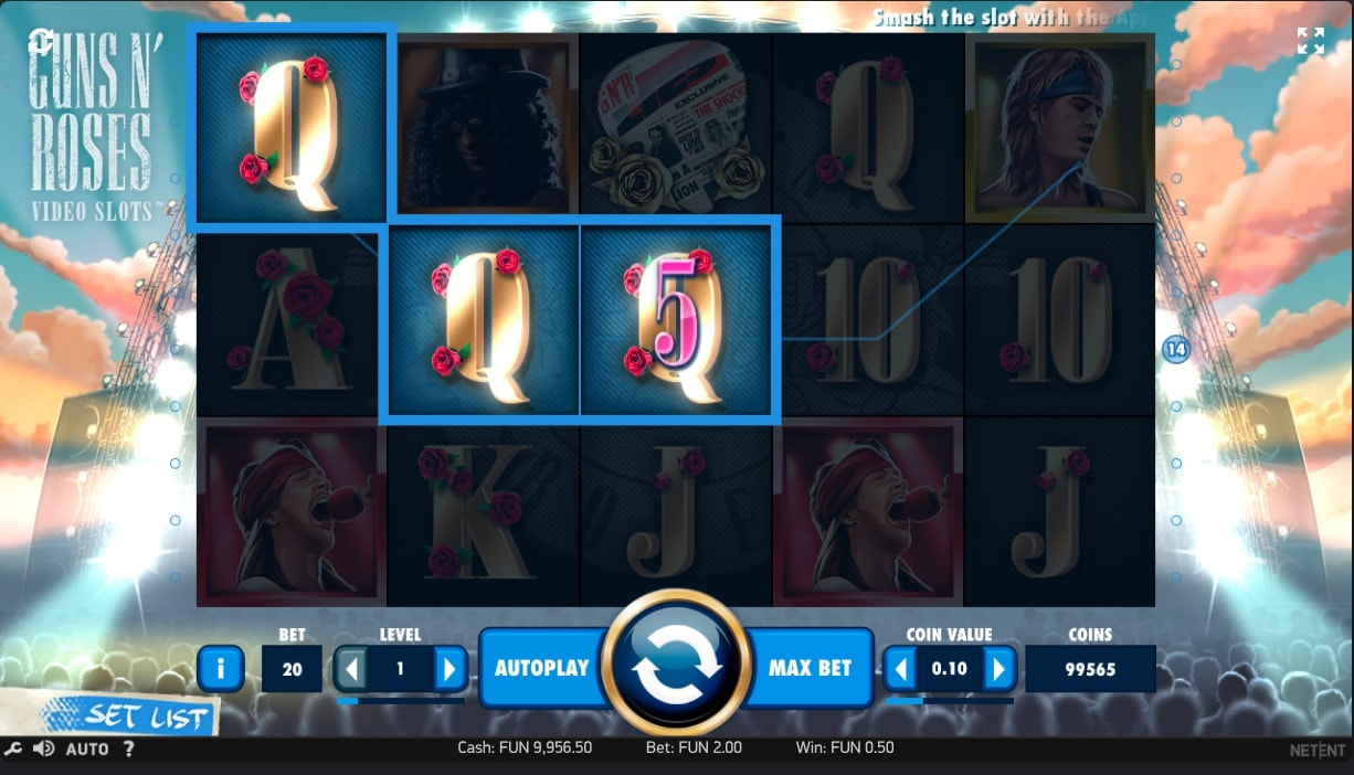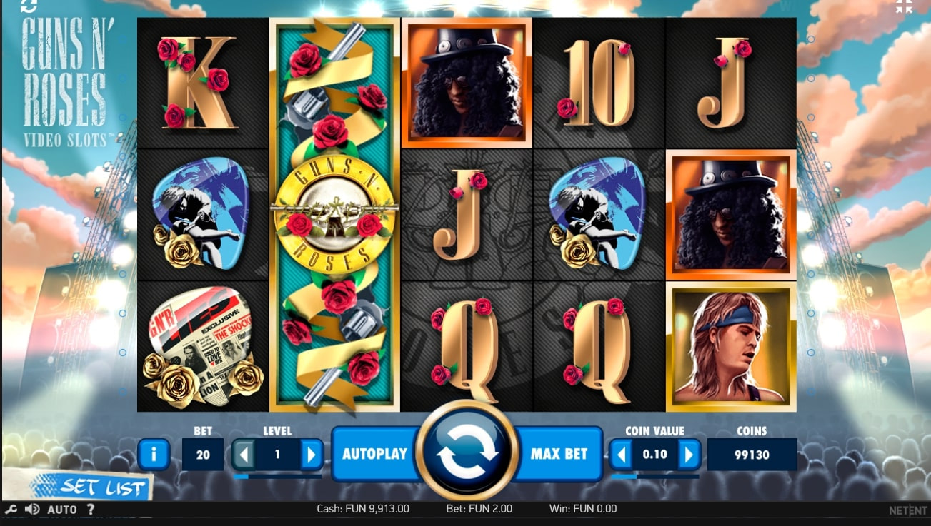 Click the Setlist button and you can listen to one of five Guns N’ Roses hits as you play the slot. The options include Sweet Child O’ Mine, Paradise City and Welcome to the Jungle.