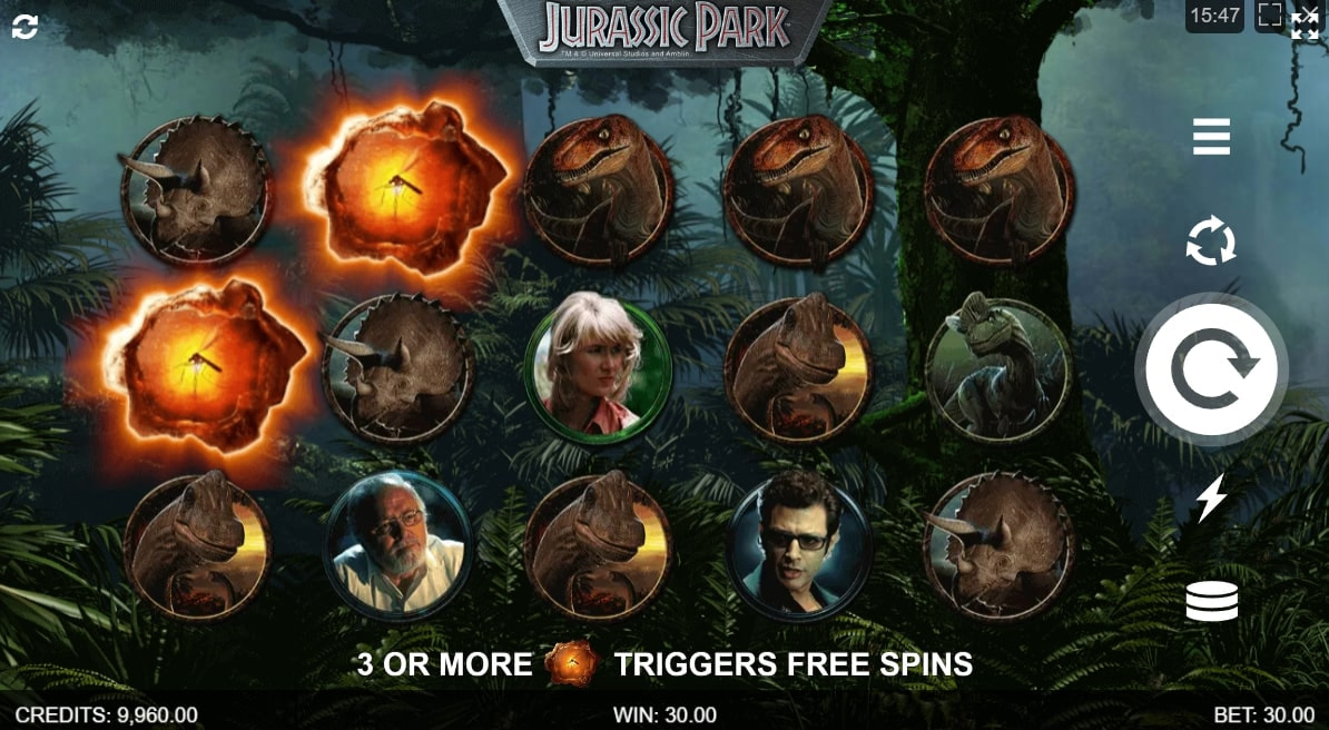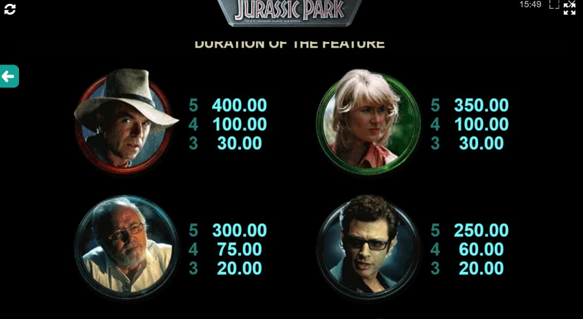 A group of five dinosaurs from the original movie are the lower-paying slot symbols in the game. Higher-paying icons are the lead adult characters, such as Dr Ian Malcolm and Dr Alan Grant, with the latter paying out the most.