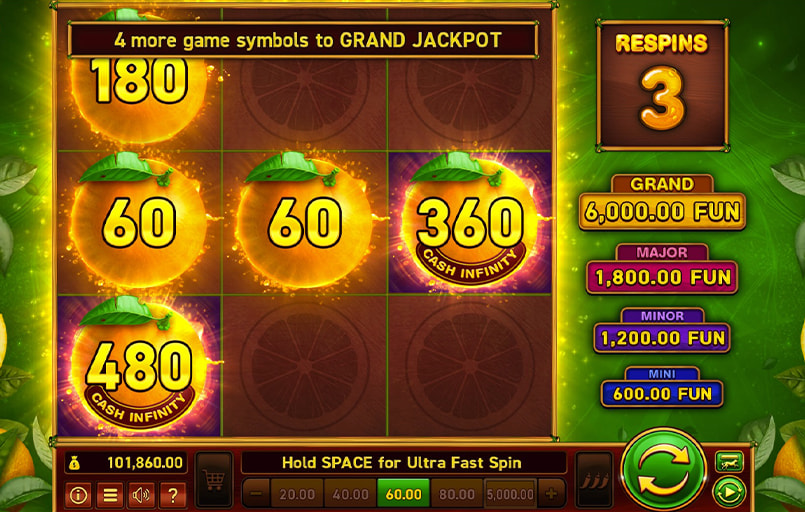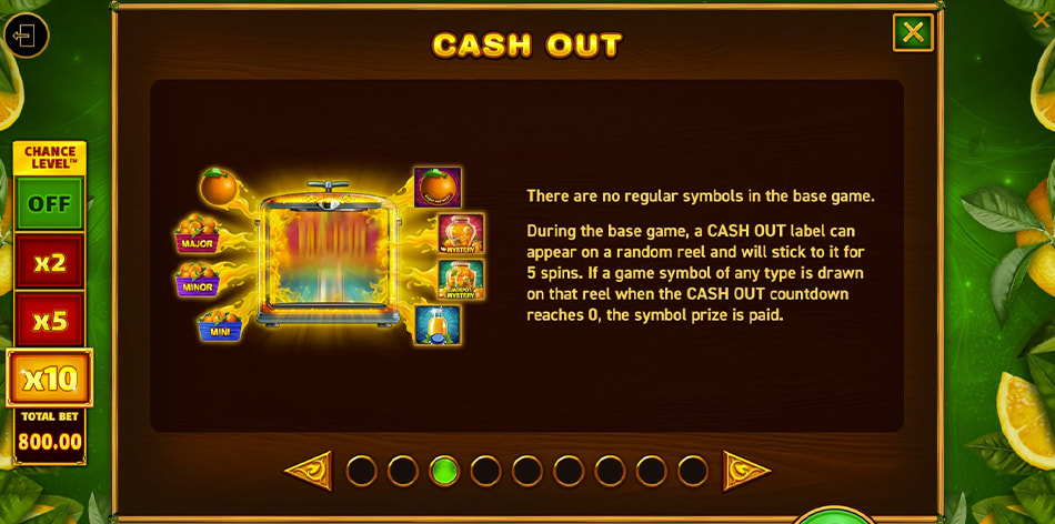 Important to note is that there are no regular symbols in the Magic Fruit$: Oranges base game. However, the Cash Out label can appear at random, sticking for 5 spins until the countdown reaches 0, which then pays the symbol prize.