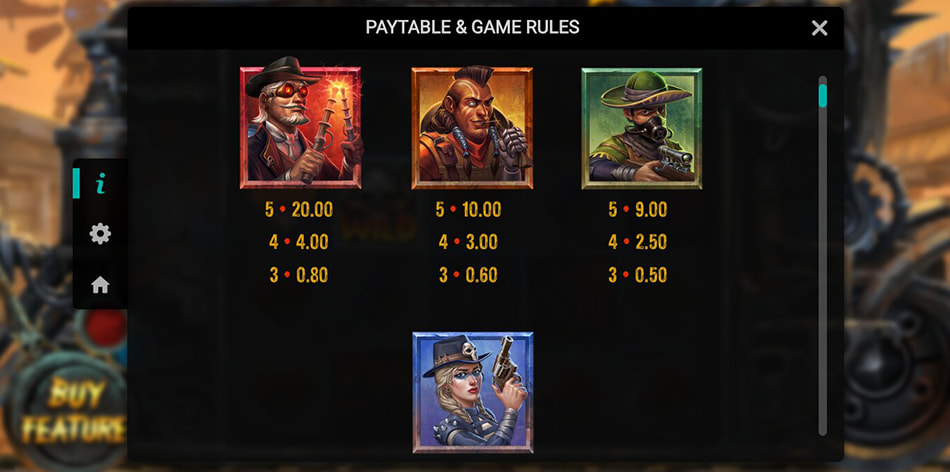 Money Train 2 has eight regular paying symbols: four low-paying playing card suit icons and four characters. The most rewarding of these is the Necromancer (the red-framed man putting two conductors together). For five on a payline, he pays 20x.