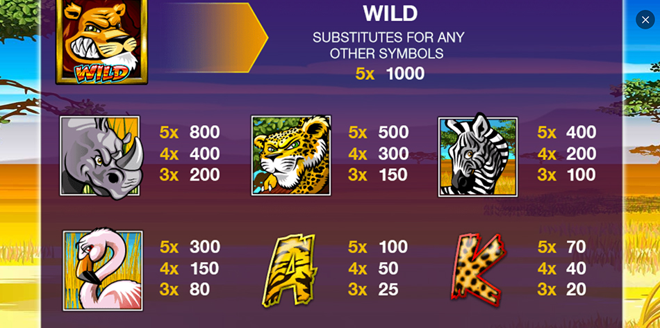 Wild Gambler is an animal-themed online slot set in the open grasslands of Africa. It’s presented with cartoonish graphics and has a jungle-style soundtrack and various animal sound effects. The visuals aren’t particularly immersive, but the design is still good.