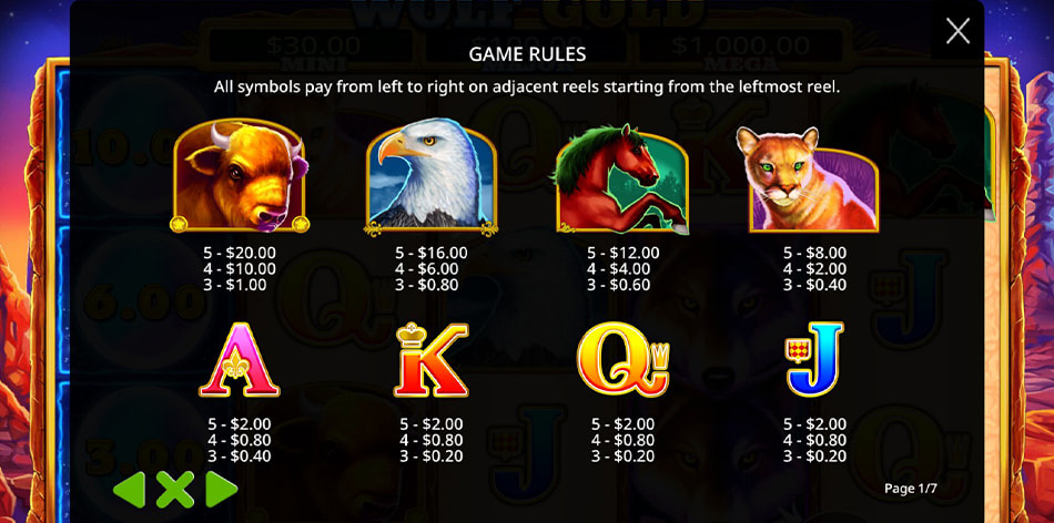 There are eight standard symbols in Wolf Gold: four playing card royals (J, Q, K and A), a cougar, a mustang, an eagle and a buffalo. The buffalo is the most rewarding, paying 20x for five on a payline.